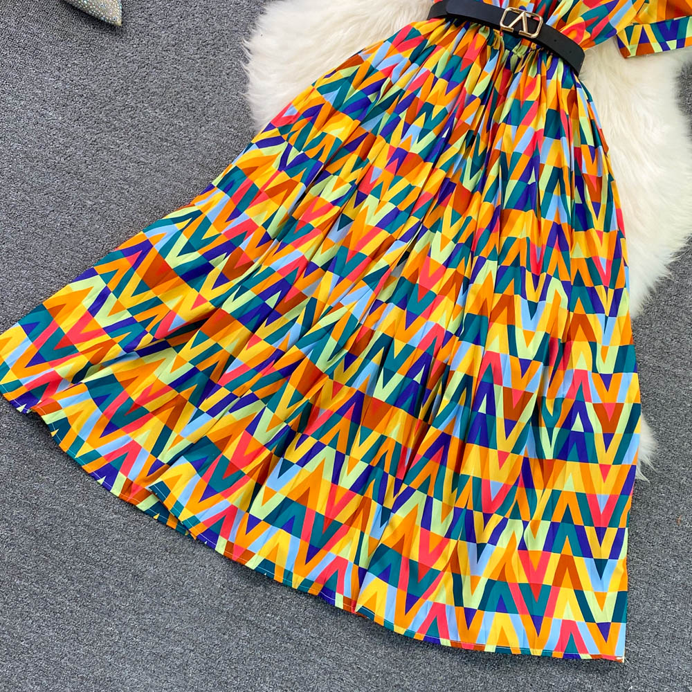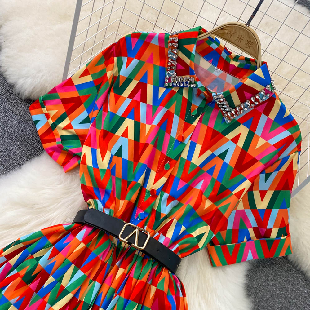 Summer Light Mature Style Lapel With Waistband And Thin Geometric Check Print A-line Dress